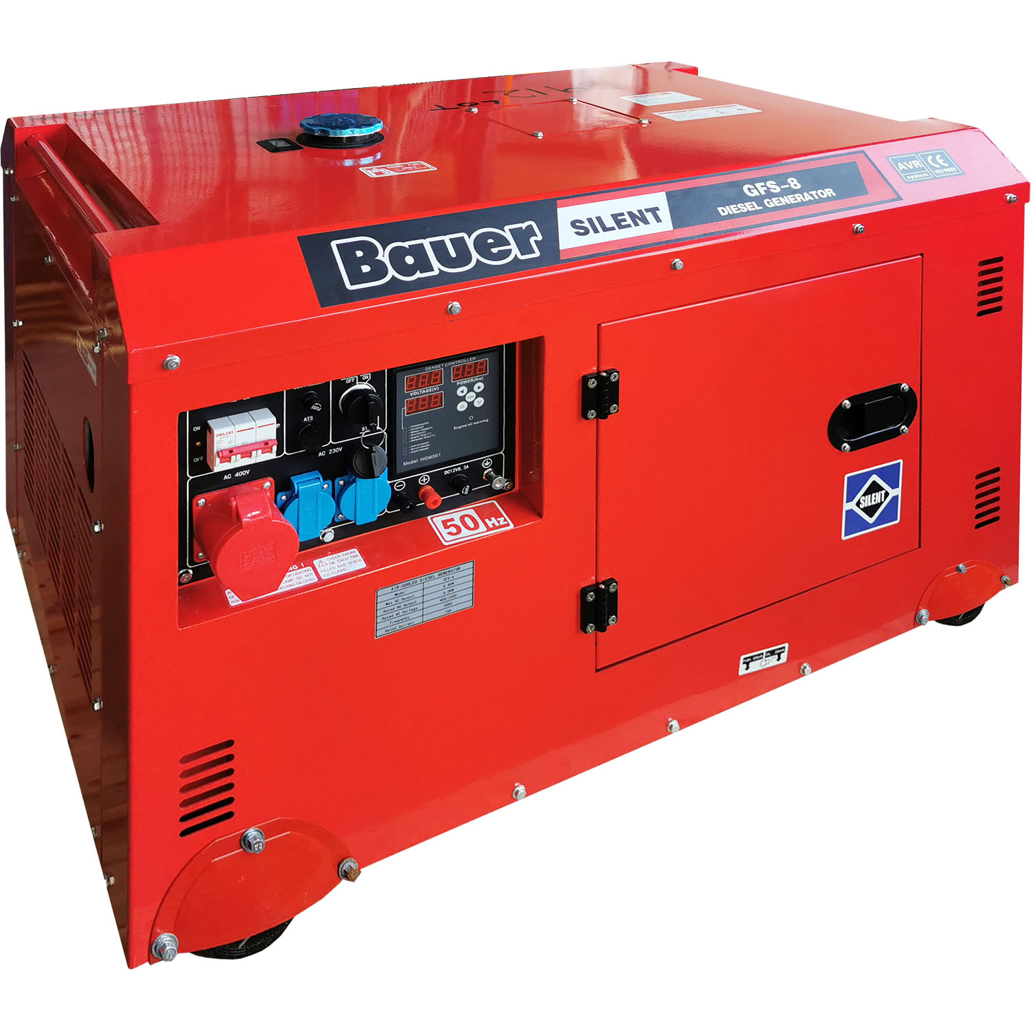 Das Bauer GFS-8 ATS Notstromaggregat bietet eine Dauerleistung von 8 kW / 9,5 kVA. Es ist 1.070 Millimeter lang, 745 Millimeter breit und 815 Millimeter hoch. Damit ist es für seine Leistungsklasse extrem kompakt. Mit 180 kg Nettogewicht ist es vergleichsweise leicht.